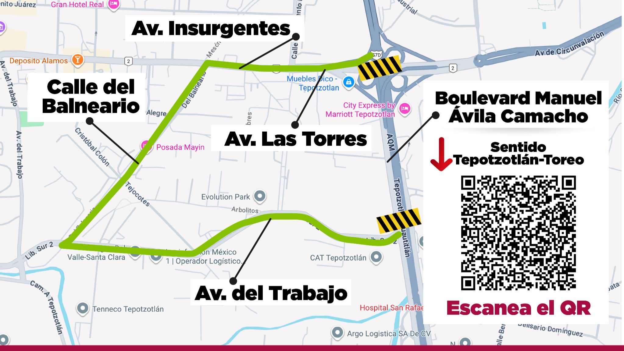 Para quienes circulen desde Tepotzotlán con dirección al Toreo, el desvío se ubicará a la altura de la terminal alterna de autobuses de Tepotzotlán. El recorrido recomendado es el siguiente: