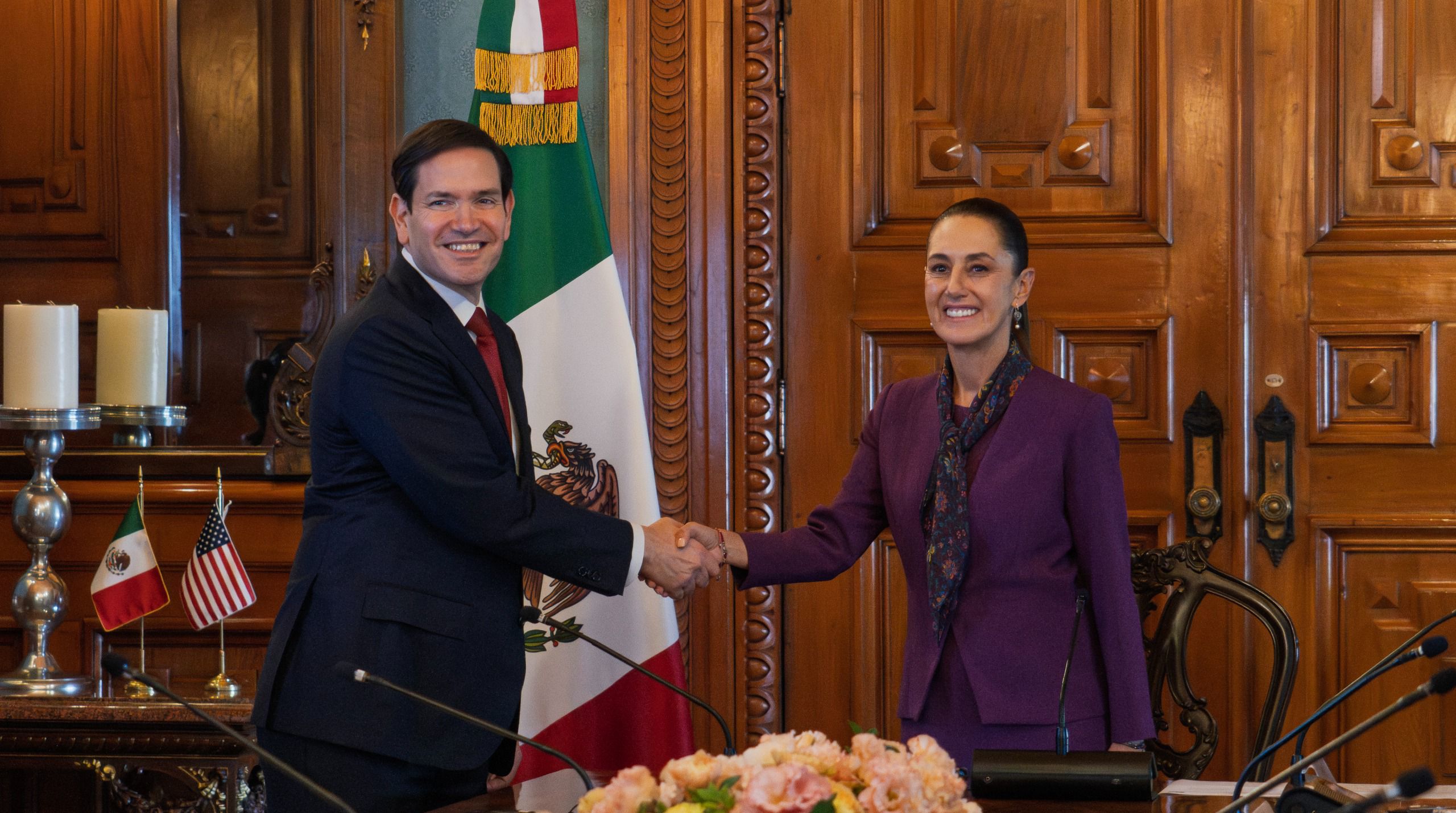 “En Palacio Nacional, la presidenta Claudia Sheinbaum recibe al secretario de Estado de los Estados Unidos, Marco Rubio. Conversarán sobre el entendimiento de cooperación en materia de seguridad fronteriza con respeto a las soberanías”, informaron.